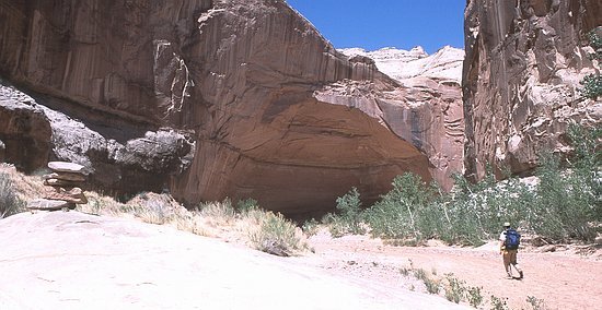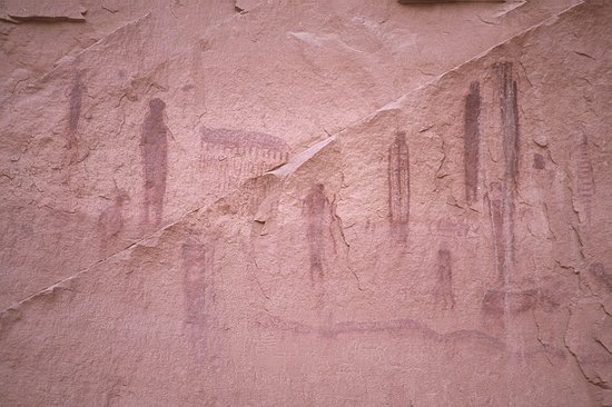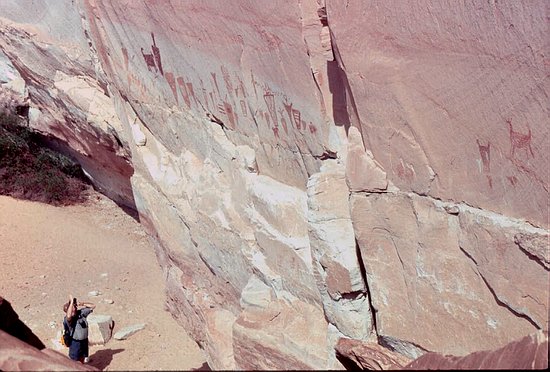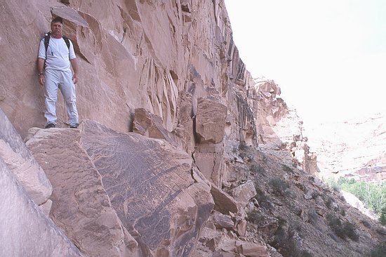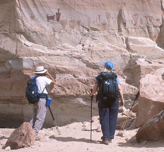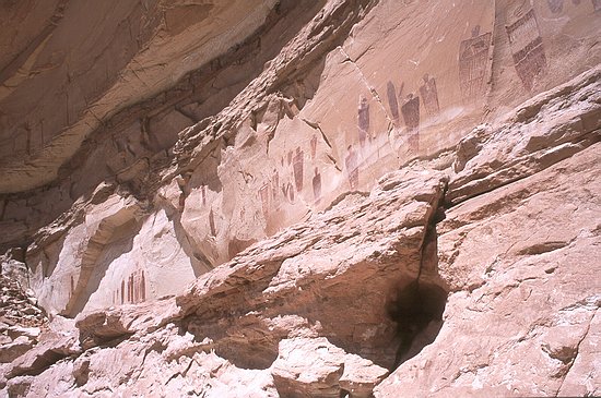 The turning point of our hike was the "Great Gallery", a collection of the most magnificent pictographs and petroglyps (figures etched in the rock with a sharp stone) that the canyon had to offer. Nobody really knows why people created those drawings. They may have had some ceremonial meaning or they were drawn just for fun. By then, television and golf had not been invented yet, and I can well understand if folks were bored and were looking for some creative pastime.