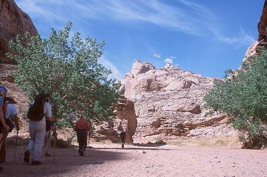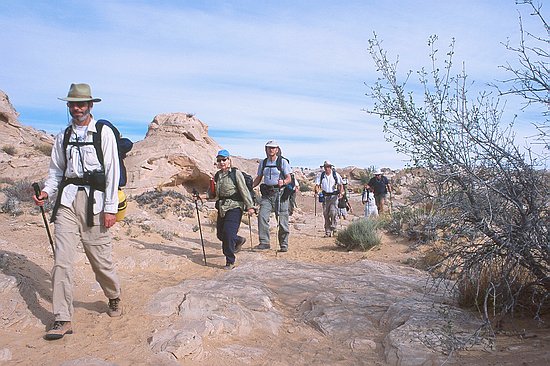 Day 3 On the third day we hiked down to Horseshoe Canyon. It was a weird way of hiking for me. Where I grew up, hiking consisted in climbing a mountain, having a drink on the summit, and then going down again. This strategy does not work in Utah. It's all inverted. Everything starts from a high-elevation plain, and the sights are down in canyons. Below is the start of our party heading down into the canyon.