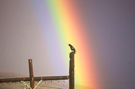 A raven was joyfully announcing the return of the sun, lit by the rainbow in the back.