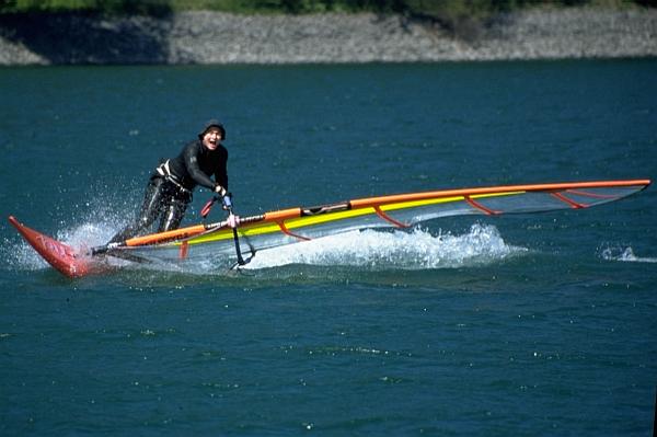 Carving a jibe at Walchensee (The silly hat protects my bald from too much UV radiation).