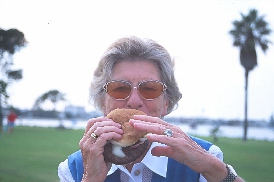 It was also the first day in my mother's life eating a authentic American charbroiled Hamburger. This documents this remarkable moment: