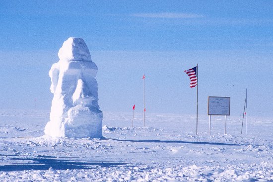 Next vicinity of the South Pole. From right to left: Rods marking the average and "instantaneous" South Pole, as measured on January 1, 2000. (There is a difference between both poles of about one meter because the Earth is not only turning but also wobbling around its average axis of rotation.) Plaque commemorating Amundsen and Scott, U.S. flag, and snow statue built by an unknown artist from the South Pole staff resembling one of the ancient stones erected on the Easter Islands.