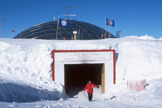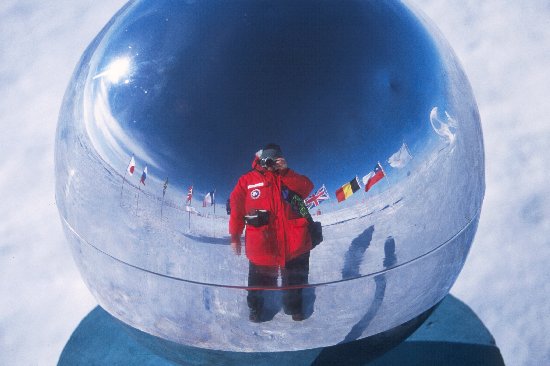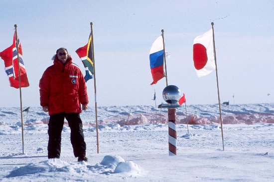 Me, standing next to the "Ceremonial Pole" consisting of a wooden rod with a reflecting metal sphere on top. Such a pole marker was first used during the "International Geophysical Year" in 1957, when the first South Pole station was built. According to rumors that I have heard, the sun reflecting in the sphere helped planes to find the pole in the middle of a vast icy plain. The original sphere can now be admired in the Canterbury Museum in Christchurch New Zealand, which also accomodates a comprehensive Antarctic exhibition. The flags around the Ceremonial Pole are from the twelve countries that initially signed the Antarctic Treaty, regulating international activities in Antarctica.