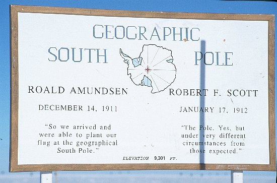 Plaque erected one meter next to the South Pole. The shadow is from the rod that is tucked in the snow at the place of the pole. The exact location of the pole is surveyed once a year. This is necessary because the ice cap drifts by about 10 meters each year over the Antarctic continent, lying 3000 meter underneath.