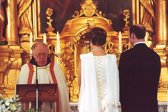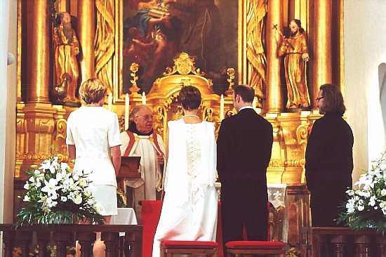The next day was the most serious one: The promise of marriage in front of the lord. My friends chose a small church on a hillside overlooking Garmisch-Partenkirchen (Actually, it was the same church where my parents married over 30 years ago). It is a beautiful jewel in baroque style, like many churches and chapels in Bavaria. Everything is full of gold and precious old paintings. The priest was very dignified, emphasizing the important moment.