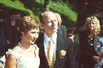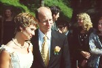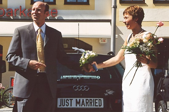 After they had bravely endured serious suffering we all danced waltz on a parking lot and opened the first bottles of champagne. Obviously delighted, bridegroom and bride posed in front of their car before we went to another place, having more champagne and beer.