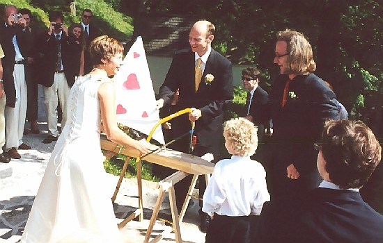 Outside the church, the next torture was waiting. The couple had to prove that they are able of solving a problem together: Sawing a beam (or more precisely, a small windsurfer) in parts. They solved the task faultlessly, even without arguing. It will certainly not be possible to use the debris again for windsurfing!
