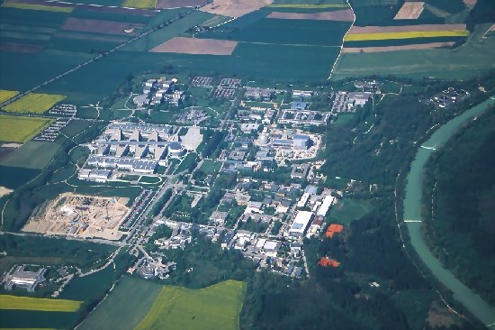 Next, the facilities of the Technical University of Munich close to Garching. Here I have studied physics from the fifth semester onward. The Physics Department is in the middle of the upper right quarter of the campus. It's just above a nuclear research reactor looking like an oversized egg. A new reactor is currently under construction; it is the large building on the right side of the "egg". Most buildings in the bottom left corner have also been built in the last ten year after I had left university. The island of high-technology is in the middle of a rural landscape. The yellow color of the fields is from rape, which makes a beautiful sight.
