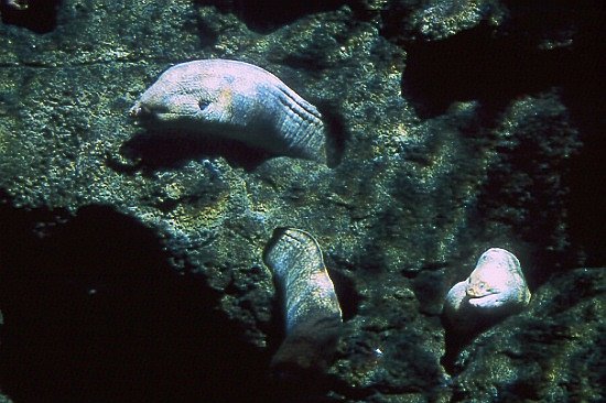 SeaWorld has also many aquariums, featuring sharks, rays, and colorful fish. Below is the moray exhibit. They look quite terrifying when they suddenly come out of their wormholes.