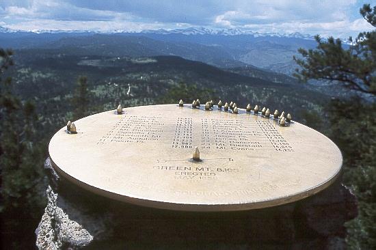The next day, I hiked up to Green Mountain, just west of Boulder. The summit is marked by a plaque, donated by the local hiking club, that gives the height and position of all peaks of the Rockys in the vicinity of Boulder. There are quite a few that are above 12,000 feet!