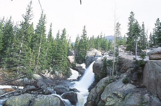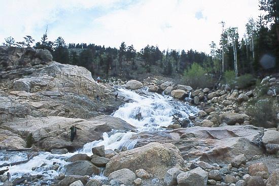 Below is the Alluvial Fan of Horseshoe Park. It was formed on July 15, 1982, when Lawn Lake higher up in the mountains broke through its terminal moraine that had held since the end of the last ice age, thousands of years ago. The release of 29 million gallons of water swept trees and car-sized boulders four miles down to the valley floor. Three campers were killed and the town of Estes Park at the foot of the National Park was flooded to a depth of six feet. Look for the fischerman to get a feeling for the size of the boulders!