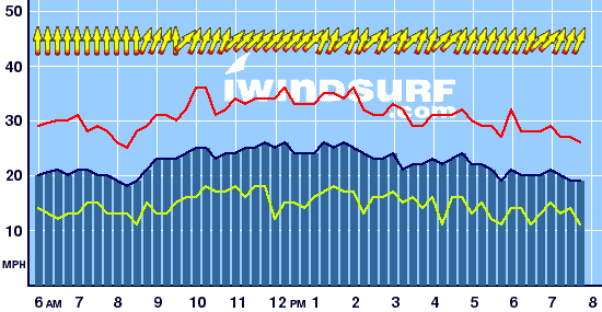 The next weekend was Memorial Day Weekend and I drove up to Lake Isabella, about 300 miles north of San Diego. I did the same trip last years. Look on the Updater from May 2000! The lake is famous for good wind and I was also not disappointed this year. From Saturday to Monday, the wind speed was steadily increasing. On Monday, gusts reached over 35 miles per hour, which is about 7 Beaufort. I was staying overnight just below the sensor that provided the measurement below.