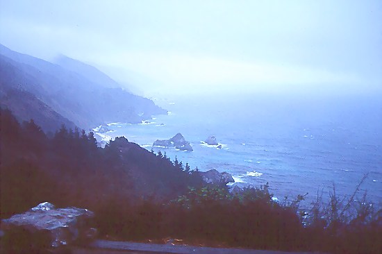 Day 13 The storm went on all night and the next morning. Before we headed south on Highway One, I had to refuel our motor home (it consumed about 29 liters per 100 kilometers). The attendant of the gas-station said "It will be a dangerous drive!". I did not quite understand the guy's concerns and replied, "Yeah, it's a bit windy, we just drive slowly and should be fine." During the next hours, I understood what he meant. The rain and wind lead to numerous land slides and we saw several trucks with shovels at front, ploughing away the debris. It almost felt like driving at home in winter. I had to keep an eye on the steep slopes next to the street, and pray that no big rock is coming loose. Land and ocean were in fury, which a picture can hardly capture.