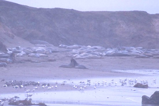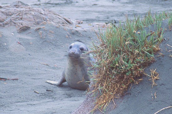 With god's help, we managed to get around all obstacles without damaging the car. We stopped for a break at Point Piedras Blancas, south of the Santa Lucia Range. The beach was complete claimed by elephant seals. Below, a small female is lurking around the corner.