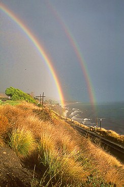 We continued south; had a coffee break at Morro Bay, located just opposite of a unique 600-feet-high volcanic rock; turned inland; drove through San Luis Obispo; and headed further south on highway 101. It continued raining until we hit the coast 40 kilometers west of Santa Barbara. Then, the storm finally cleared, giving way to a phenomenal rainbow.