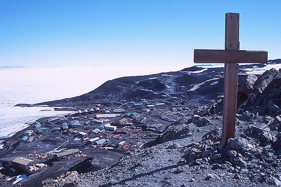 I arrived in the early morning at McMurdo station. As the flight to the South Pole was scheduled for the next day, I had time to climb the 228 m high Observation Hill, which provides the best views of McMurdo. The cross on top commemorates Captain Scott and his party who lost their lives on their epic journey to the South Pole in 1912.