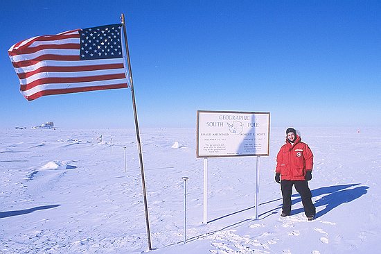 Here I am, next to the Geographic South Pole. The board next to me commemorates the expeditions of Roald Amundsen and Robert F. Scott in 1911/12. The Pole is marked by the short metal rod between the board and the flag.