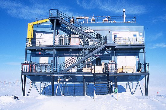 My work place at the South Pole is the Atmospheric Research Observatory, located upwind of the main station to avoid contamination of air sampling. The building was erected in the 1997 and provides superb infrastructure. The UV spectroradiometer that I was servicing is located in a penthouse behind the yellow crane.