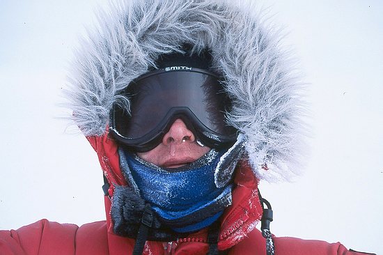 Here I am on the way back, showing typical signs of cold weather (the wind chill was about -50ºC): Frozen snot under my nose, chapped lips due to low moisture, and a bit of frost bite on my right cheek - but happy.