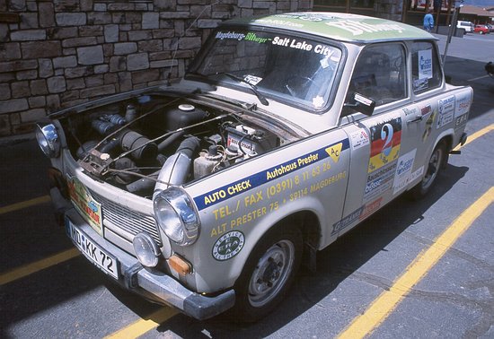 In the parking lot of Bryce Canyon's town of souvenir shops was a witness of a more recent migration. This car is called a "Trabbi", and was built in the formerly communist part of Germany. It has a two-stroke engine, which sounds like a sewing machine, and a body made of plastic. The delivery time for this marvel of German art of engineering was about 15 years. This well-preserved collector's item had authentic German license plates and some nice stickers of a even nicer German beer brand.
