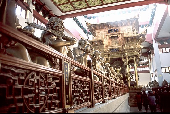 The Hall of 500 Arhats: hundreds of life-sized figures are arranged around a central temple.