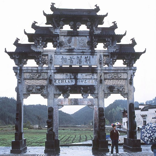 The next highlight of our trip was a visit to two ancient Chinese villages in the Southern Anhui province, Xidi and Hongcun. Both are on UNESCO's world heritage list as cultural and natural sites. Xidi was established in 1047. In former times, people had the custom of leaving their home town to earn money with a strong sense of bringing back honor to their families. When they became rich, they returned home to build archways, residences, and temples. Below is the archway of Xidi.