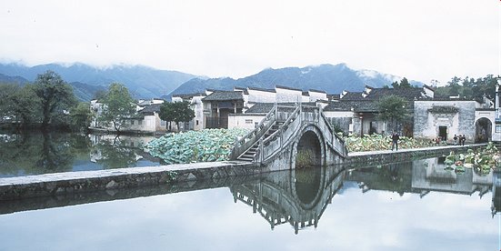 Hongcun has a similar architecture as Xidi and the shape of a ox. In the middle of the village is a pool in the shape of the crescent moon, which is regarded as the stomach of the ox. A canal zigzags through the village and is the intestine of the ox. Moreover, there are four bridges (the legs of the ox), a hill (the head), and ancient trees on top of the hill (the horns).