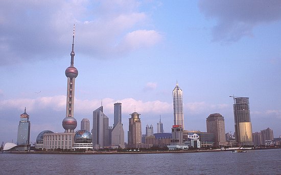 Below is a shot from the Bund, the city's one-mile long fulcrum, toward Pudong Park with its "Oriental Pearl" TV tower. With a height of 468 meters, it is the world's third tallest TV tower after the 553-meter CN Tower in Toronto and the 535-meter Moscow TV Tower. To me, the skyline looked completely surreal and out of proportion.