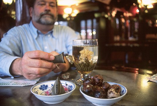 After strolling along the Bund, we visited the Huxinting teahouse in Shanghai's old town, and ordered tea. Or better, we chose from a menu of 100 different kinds of tea. The waiter brought us glasses with little green balls inside, and poured boiling water over them. The balls of tea leaves slowly opened, and beautiful flowers appeared, which were attached by little threads to the center of the tea balls. It looked beautiful, and tasted even better.