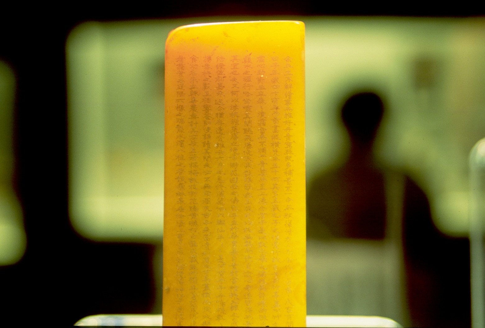 Stamps are a very import part of Chinese culture and were used to prove the authenticity of documents. Stamp marks can be found on almost every old scroll, and also on newer ones made for tourists. Stamps are made from a variety of materials including wood, horn, or stone. The one below is made of yellow jade. It is about 1 inch wide and decorated with tiny Chinese letters. The love to detail is just incredible. Click here to see a full-size picture of the stamp (326 kBytes).