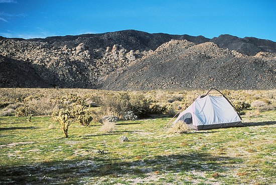 I focused my leisure time in February 2003 mostly on the eastern parts of San Diego county. I went mountain biking in Cuyamaca Rancho State Park, visited a gem mine east of McCain valley (together with the owners of the claim), and spent a weekend in Anza Borrego State Park where I hiked up to Jacumba Mountain and along abandoned railroad tracks. Below is a picture from our camp at "Dos Cabezas" with Jacumba Mountain in the background.