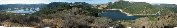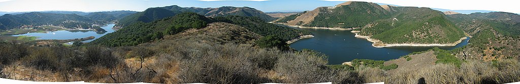 | I've spent Labor Day weekend at Lopez Lake, windsurfing. The lake is well known for good thermal winds, starting at noon. It was my second visit after September 2002. Below is a view from top of a neat outlook between the two arms that belong to the lake. The windsurfing area is on the left side. | |||||||