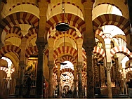| Mequita in Cordoba The Mezquita is the main attraction of Córdoba, if not Spain. It consists of a huge hall filled with double arches resting on about 850 pillars made from granite jasper and marble. Walking through this amazing maze took our breath away. Construction started in the 10th century when Córdoba was the largest, most prosperous city of Europe. Inside this hall is the "Mihrab", a place for Islamic worship, featuring a huge dome decorated with exquisite Byzantine mosaics of gold. In the 16th century, King Carlos V. ordered that a cathedral should be built in the center of the Mezquita. The size and richness in detail of the church are breathtaking. However, both Tine and I were shocked by the disrespect that let to the destruction of a large part of Mezquita and its artwork by Christian zealots. In fact, even King Carlos V. regretted his decision to build a cathedral within the Mezquita when he saw what he had destroyed, but then it was too late. | |||||||||