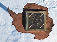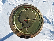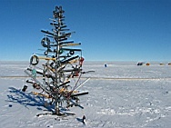 | South Pole Markers The South Pole is covered by a 2830-meter-thick glacier, which moves over the bedrock at a speed of about 10 meters per year. Every year on January 1, the exact position of the South Pole is accurately determined by the U.S. Geological Survey and a rod with a new marker is placed at the Pole's location. Below are pictures of the markers of the years 2004 - 2006. Markers from the years 2000 - 2002 are here. | |||||||