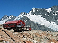 | Mount Cook National Park On the next day, I walked from the Hermitage up to Mueller Hut, located opposite of Mt. Sefton and 1200 meters above Hooker Valley. The views on glaciers, alpine lakes surrounded by hugh moraines, and mighty mountains were breathtaking. Mt. Cook was in sight almost all the time and framed by a cloudless blue sky. | ||||||||||||
