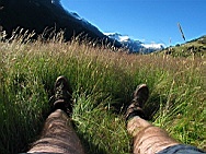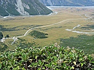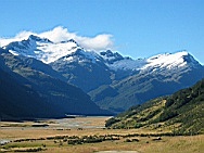 | Rees Valley During the next four days, I stayed at a friend's house in Alexandra, visited his institute on the first day, and drove the following day to Glenorchy, located at the end of Lake Wakatipu. From there, I hiked up the Rees River toward Mount Aspiring National Park. It was like walking through a fairy tale landscape. | ||||||||||||