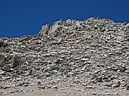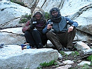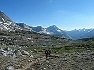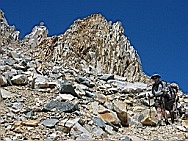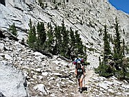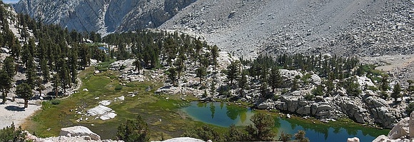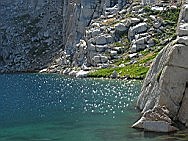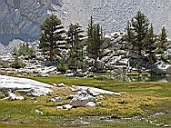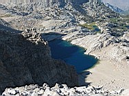 | 14-16 August 2009: Meysan Lake Area The destination of the second trip was Mount Mallory (13850 ft) and Mount LeConte (13930 ft). Both peaks are a few miles south of Mt. Whitney, the highest mountain in the contiguous United States. We started hiking at Whitney Portal, going up the Meysan Lake Trail. Enroute we passed a couple of beautiful small lakes embedded in green meadows. We arrived at Meysan Lake in the late afternoon and pitched our tents. The lake was sparkling in the evening sun and I couldn't resist to go for a swim in the crystal clear water. The next day, we climbed up Mount Mallory, scrambling up a steep chute. When I stood on the summit, I set a new personal record for the highest mountain climbed. But this new record lasted only a short time: two hours later, I set foot on Mount LeConte, which is 80 feet higher. Two records in one day, woo hoo!   | ||||||||||||