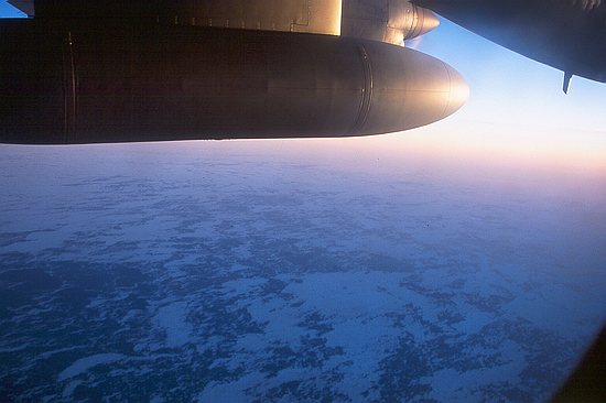 Flight toward the raising sun. In the foreground is one of the plane's ancillary tanks.