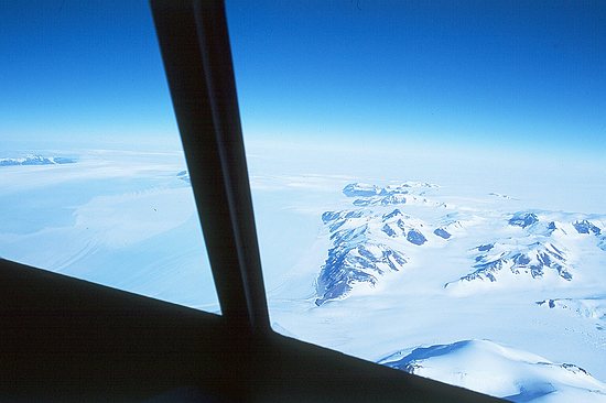 View through the right cockpit window on the Beardmore Glacier with the Polar Plateau in the background.