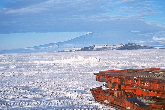 Mount Erebus with McMurdo at its foot seen from the Pegasus ice runway.