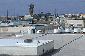 | In October 1998, I left the Fraunhofer Institute in Garmisch-Partenkirchen and joined Biospherical Instruments Inc. in San Diego. The picture shows a part of the company's roof platform with the upper part of a SUV-100 spectroradiometer in the foreground. Only the entrance optics (the black ring with a white spot in the middle) penetrate the roof. The instrument measures a solar UV spectrum every 15 minutes. The same type of instrument is also used at the other sites of the UV monitoring network operated by Biospherical instrument.