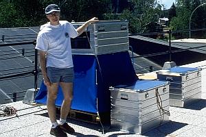 | In summer 1995, I was helping my colleague and friend Hartmut Panten to characterize the radiation environment in small green houses, which were put up in the backyard of IFU. The Mobile IFU Spectroradiometer is behind me on the right side. When you look closely you can spot some spruce trees in the green house behind my friend. There were two sorts of chambers: One group was equipped with a special foil, which blocked short-wave UV radiation. The walls of the second group was translucent to these high-energy solar rays. The goal of the research study was to investigate the impact of short-wave UV radiation on spruce tree by comparing the difference in growth in both chambers. The experiment was part of a concept study leading to larger and fully air conditioned green houses, which were put on top of the mountain Wank in 1997 (see below).