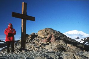 | In January 1999, I was visiting the NSF network site in McMurdo at the edge of the Ross Ice Shelf in Antarctica. The photo shows me standing next to a cross commemorating Captain Scott and his party who lost their lives on the return journey from the South Pole in 1912. The cross is erected on Observation Hill above McMurdo. In the background is Mount Erebus. It is the only active vulcano in Antarctica and almost 3800 meter high. My red parka is part of the Extreme Cold Weather gear, which you need when visiting Antarctica. Temperatures can drop down to -70 ºC. Pictures from my 1999 travel are here. I visited McMurdo again for two weeks in January 2000 after I returned from the South Pole, and for one week in January 2002. Stories and pictures can be found here.