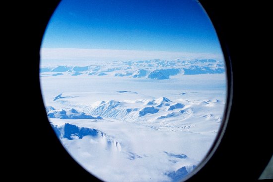 View on a mountain range enroute to South Pole. The polar ice cap - a plain without structure at high altitude - appears in the background.