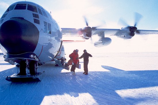 Disembarking the LC-130 at South Pole. The engines keep running to prevent them from freezing.