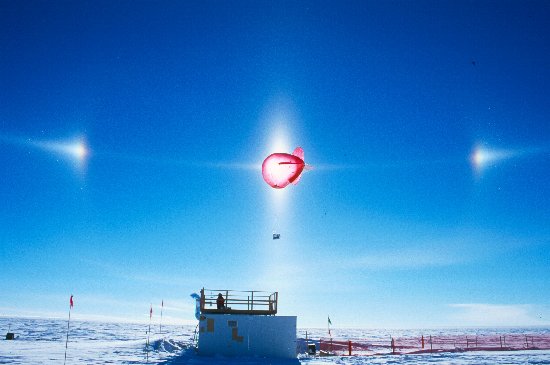 Halo around the sun (which itself is hidden behind an orange air ship). Halos are caused by ice crystals in the air, refracting sun light. Each halo looks different, depending on the shape and composition of the crystals. Halos at South Pole are most spectacular because the combination of low temperatures and wind forms snow crystals of ideal hexagonal shape buzzing in the air. The white ring on the photo goes through the sun in the middle, intersects with the halo around the sun forming two bright spots, and proceeds parallel to the horizon all around the celestial dome. So it can be seen even at the opposite side of the sun.