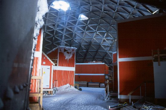 Inside the Geodesic dome. The containers on the right side include the Galley and the station's one and only pub. In the background is the communication and administration complex. The container in the middle houses the greenhouse.