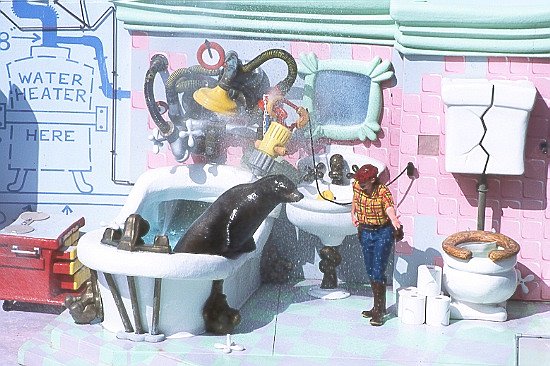 The objective of the show was to fix a plumbing problem. The sea lions did a great job to track down the leak, and fix it. It was quite funny and the trainers did a good job in assembling a varied show.