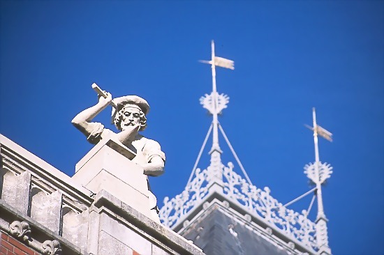 Large statues, depicting medieval professions, are placed on the cornice of the building's front walls: