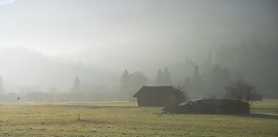 From Hanover I took a night train to Garmisch-Partenkirchen. It was the first time that I was travelling in a sleeper. The monotonous sound from the wheels is quite relaxing and so I easily fell asleep. The time in Garmisch-P. was filled with Christmas celebration, visiting friends, skiing on Zugspitze, and the New Year's Eve Party, this time blended with a sledging tour. When I arrived, I went for a walk, enjoying the beloved landscape of my homeland. It's different during every season and this time meadows shrouded in mist provided an almost mystical atmosphere.